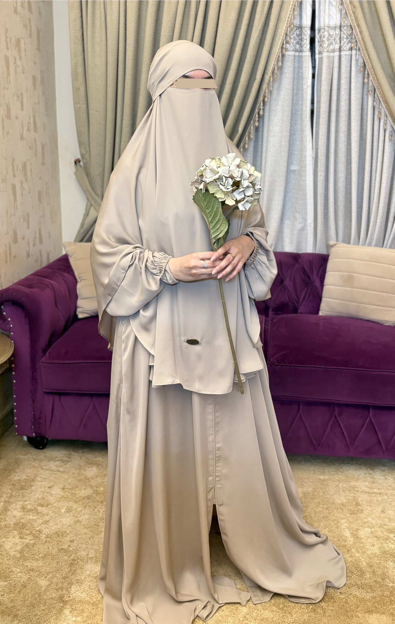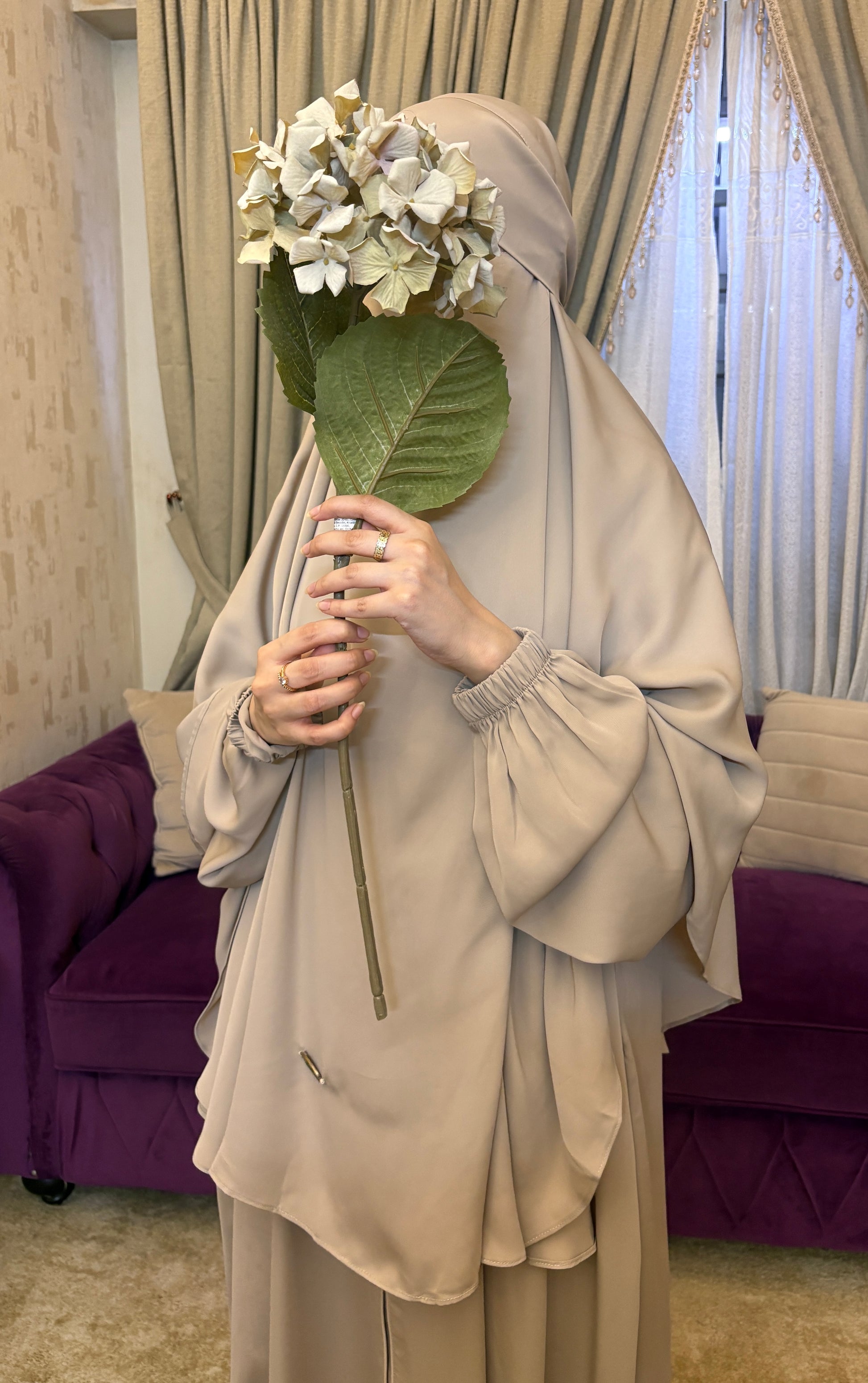 Experience serene, full-coverage modesty with our Muted Sand Jilbab Set, thoughtfully designed for Hajj and Umrah. This two-piece set includes a lightweight, breathable khimar paired with a matching abaya, offering complete coverage, comfort, and ease during long hours of worship and travel. The soft sand tone keeps your look simple and spiritually focused, while the elastic sleeve detail ensures practicality without compromising grace.